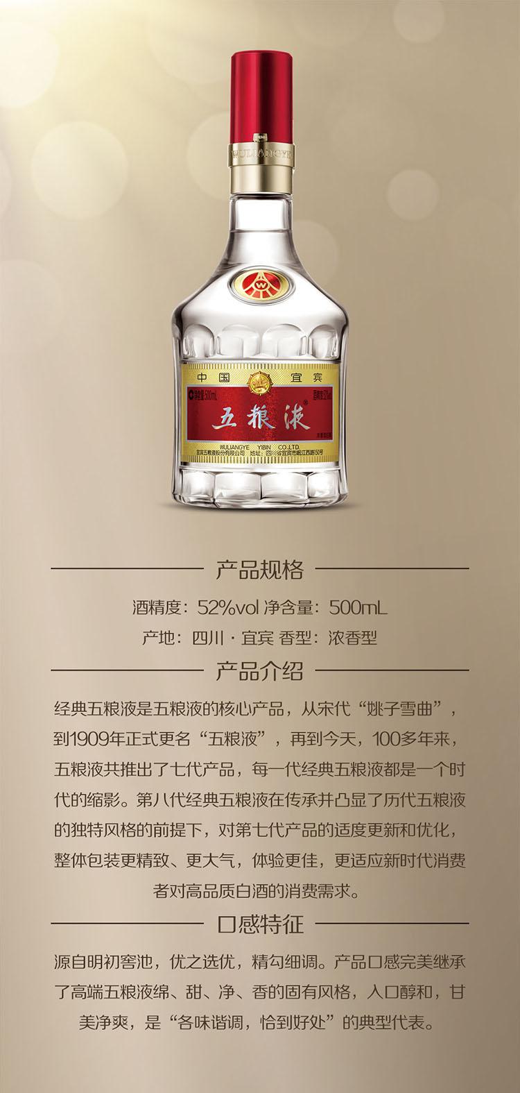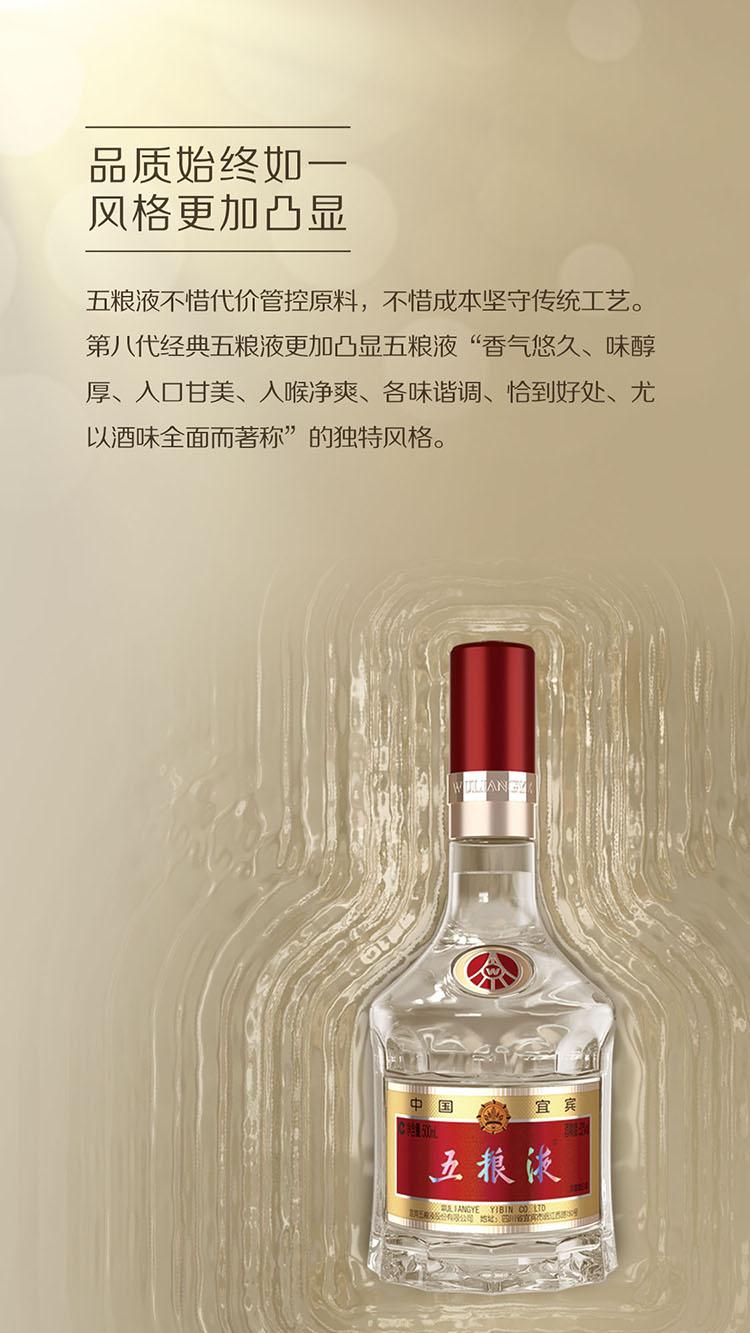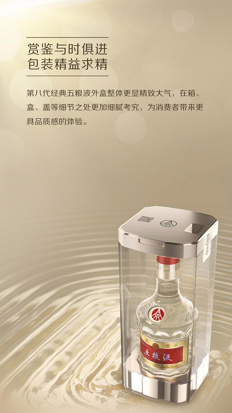 五粮液公司最经典的一款高端白酒,自得名至今已有 111 年历史,是中国白酒 “各味谐调、恰到好处” 的集大成者,深受消费者喜爱和追捧。2019 年全新上市以来,第八代经典五粮液秉承五粮液 “精益求精” 的工匠精神,在继承和延续经典基因的同时,对品质、包装、防伪进行三重升级,全面提升消费体验。