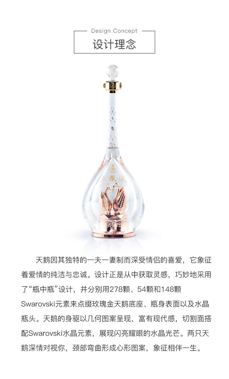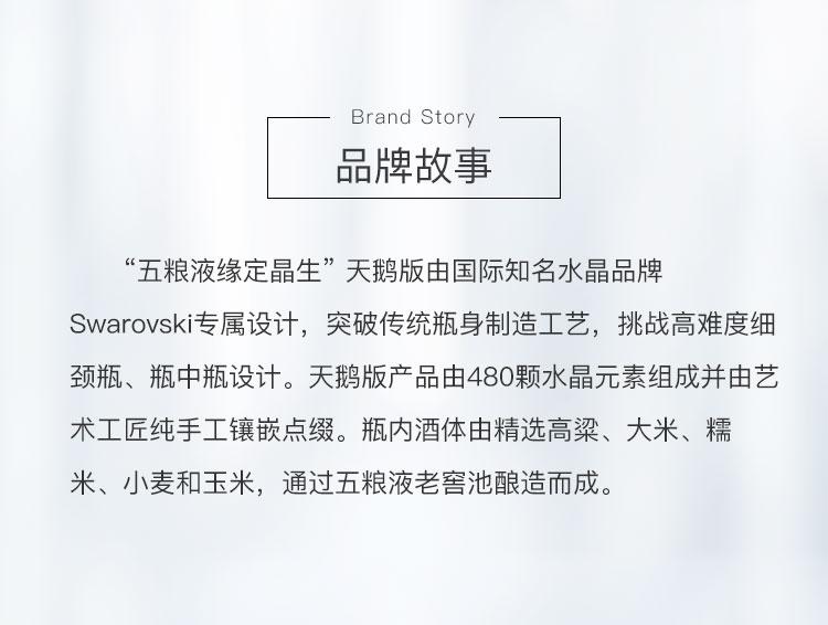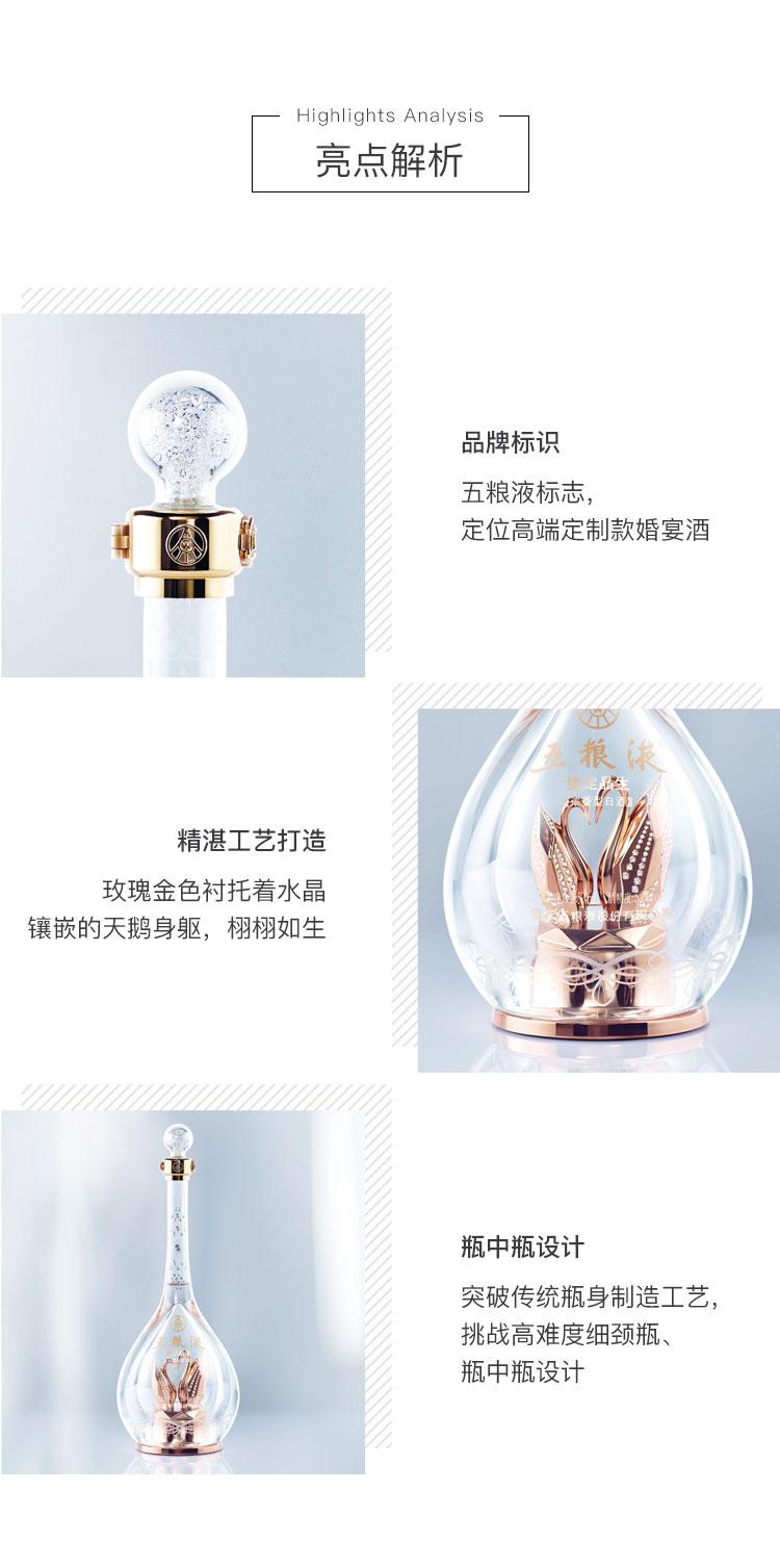 2018 年 3 月 18 日,五粮液携手施华洛世奇重磅发布了两款“五粮液 · 缘定晶生”系列产品,该系列产品主要聚焦高端婚宴场景,采用施华洛世奇经典元素,将中国传统白酒文化与西方工匠技艺完美融合,是五粮液 “1+3” 产品战略中 “年轻化、时尚化、国际化” 探索与实践的结晶。